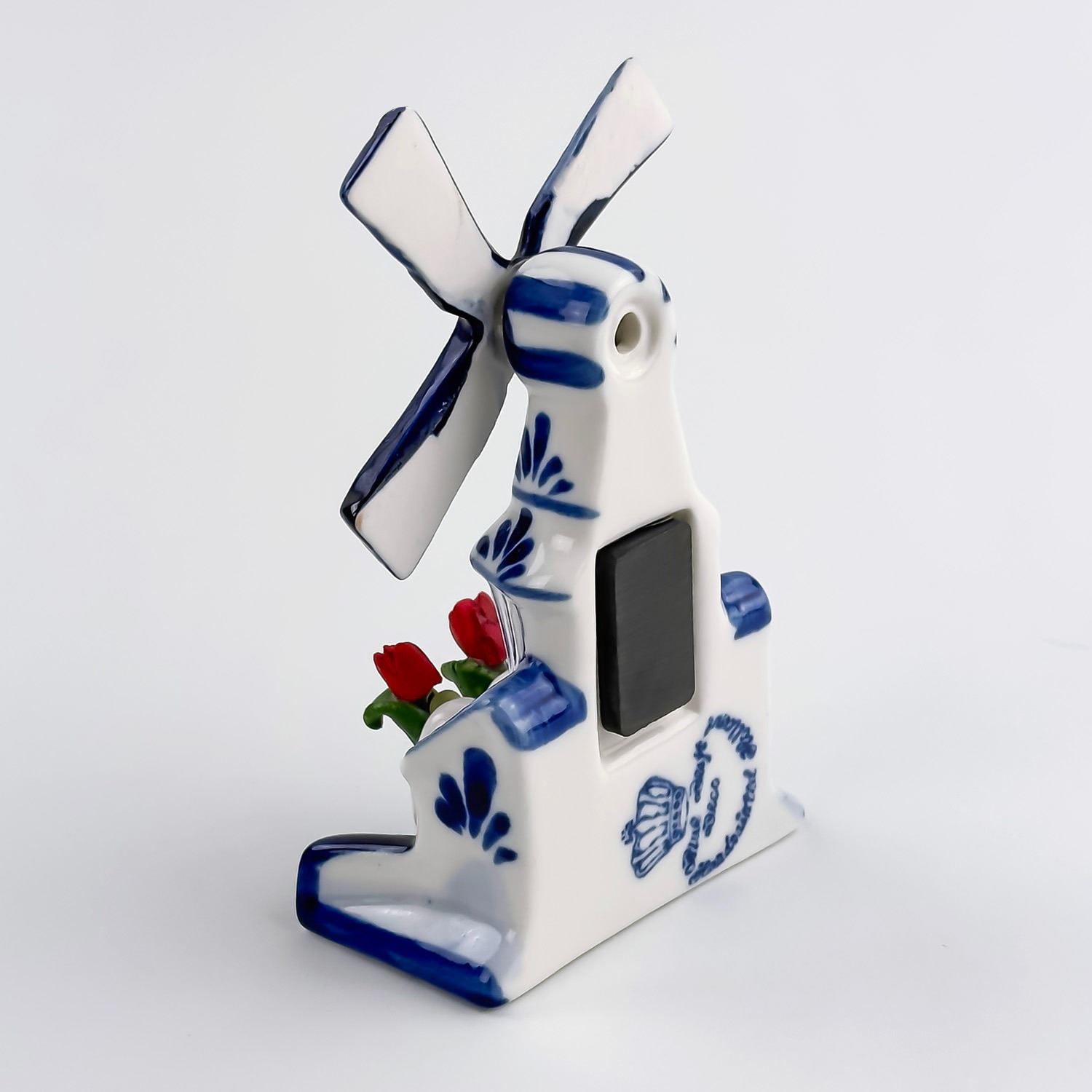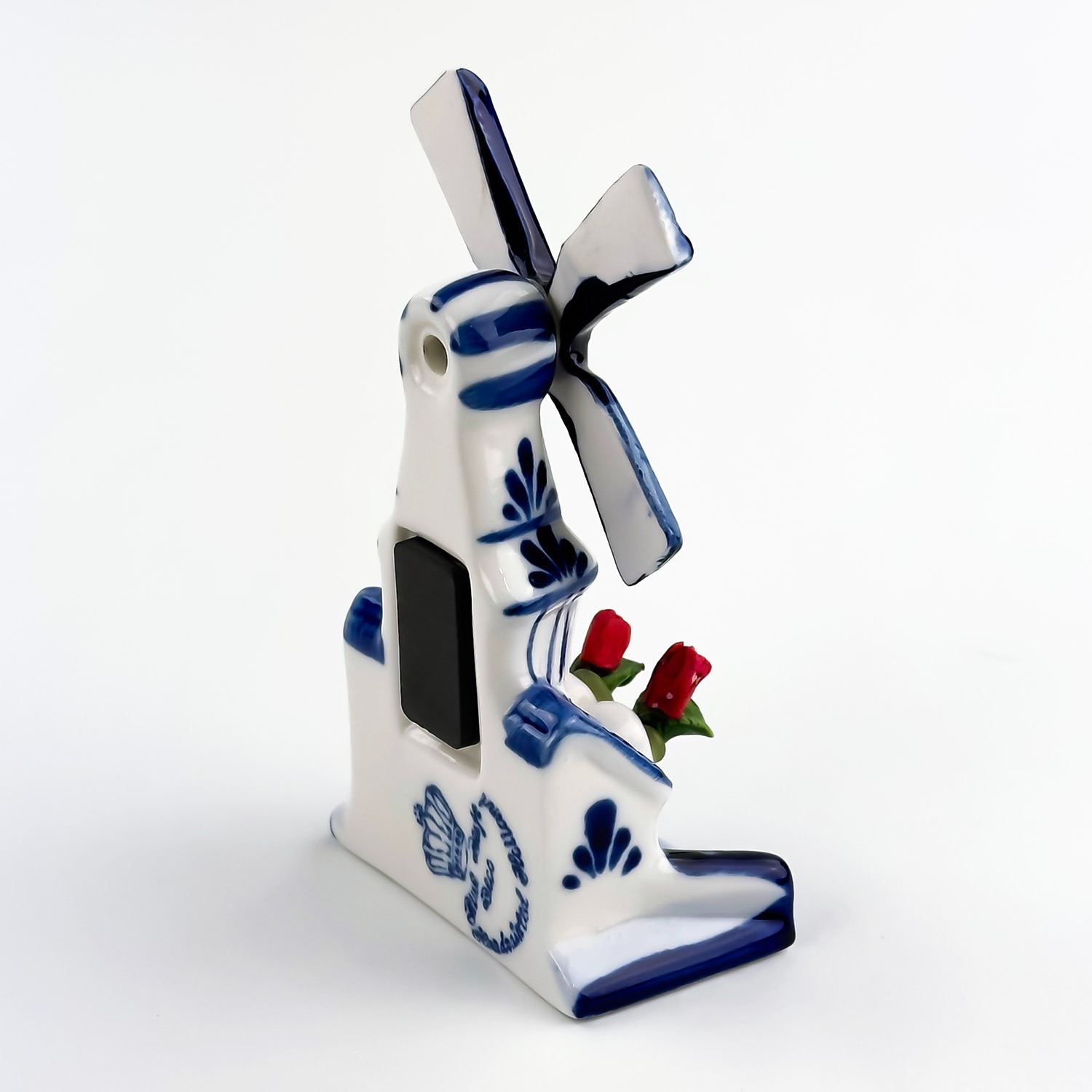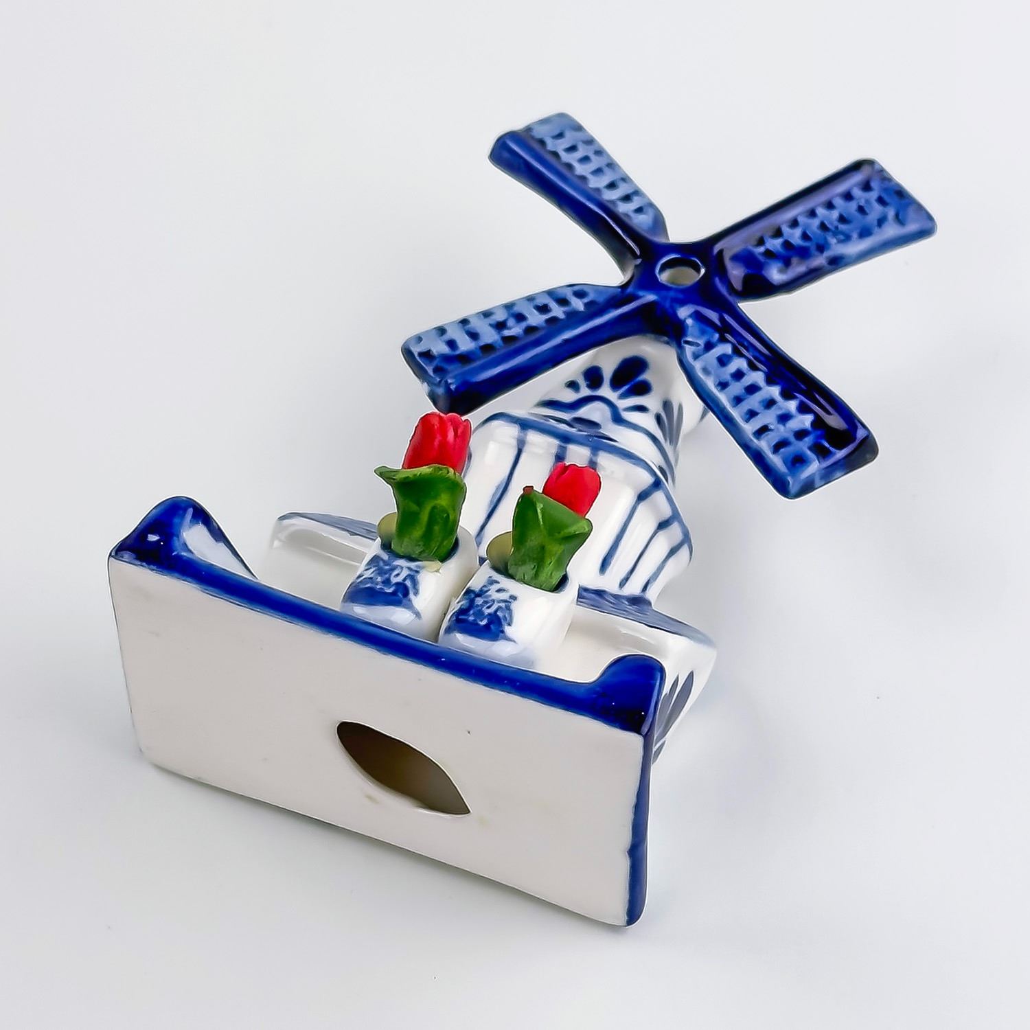 #8352 - SMALL DUTCH DELFT BLUE WINDMILL & DUTCH SHOES WITH ROSES FRIDGE MAGNET. MEASURES: 4” (10 CM) TALL BY 2.375” (6 CM) WIDE AND 1.375” (4 CM) DEEP