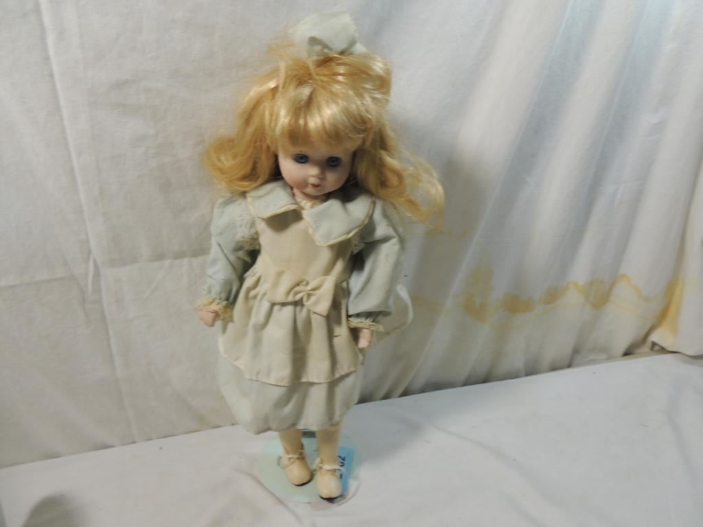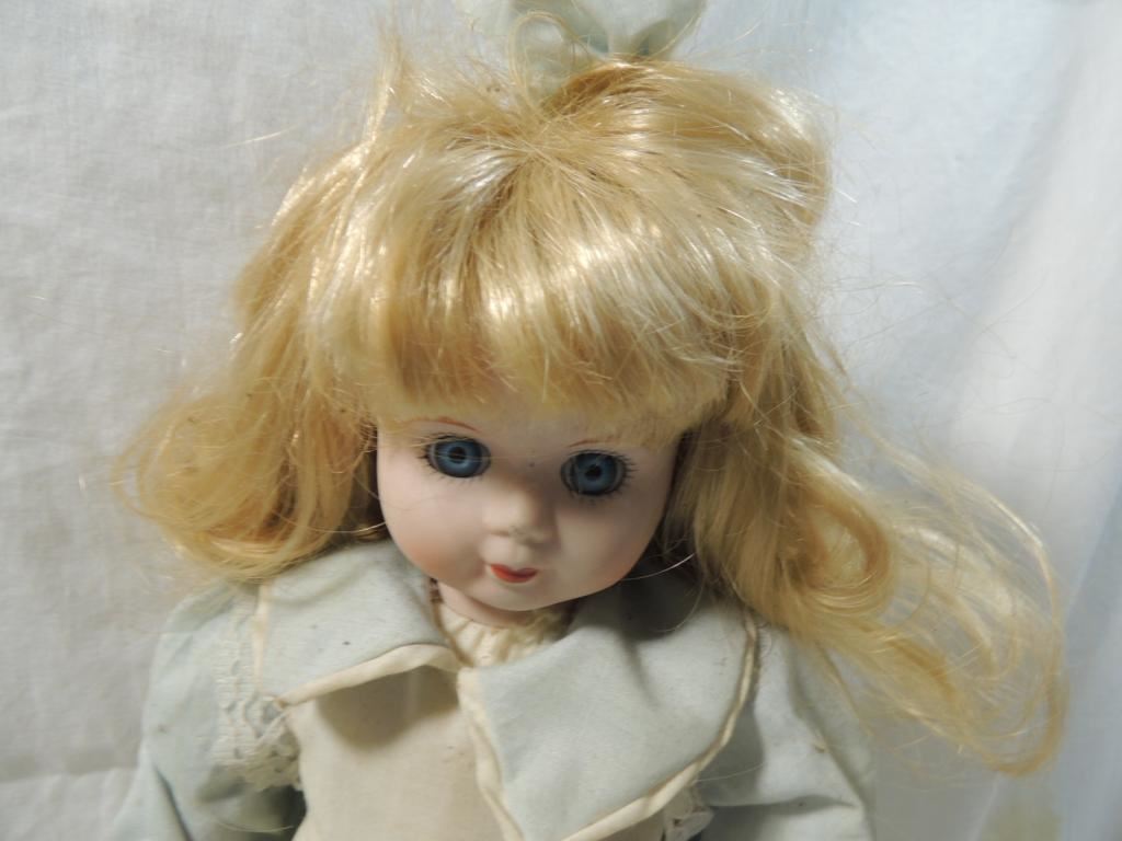 SMALL CRACK ON FACE COLLECTIBLE DOLL, DESIGNER DOLL, FROM PRIVATE DOLL COLLECTION, UNIQUE DOLL, AS SHOWN SEE PHOTO FOR MORE DETAILS.