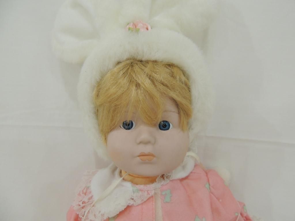 14" TALL PORCELAIN DOLL IN PINK BUNNY PRINT PAJAMAS WITH FAUX FUR BUNNY EAR HAT. AS SHOWN. SEE PHOTO FOR MORE DETAILS.