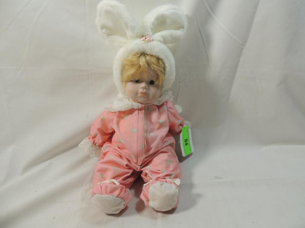 14" TALL PORCELAIN DOLL IN PINK BUNNY PRINT PAJAMAS WITH FAUX FUR BUNNY EAR HAT. AS SHOWN. SEE PHOTO FOR MORE DETAILS.