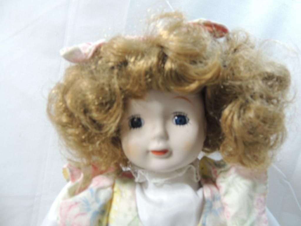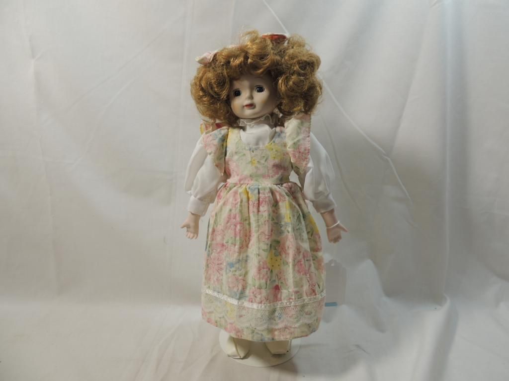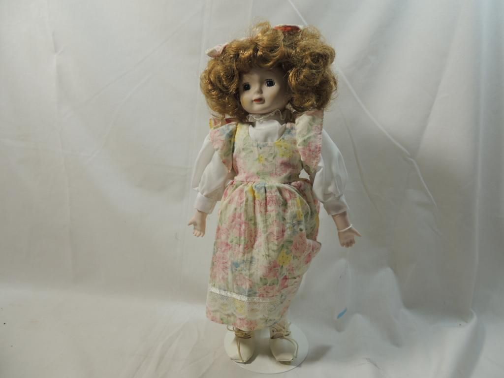 PORCELAIN DOLL WITH STRAWBERRY BLONDE CURLY HAIR PASTEL FLORAL DRESS WITH MATCHING HAIR BOW. WITH STAND. 15" TALL AS SHOWN. SEE PHOTO FO FOR MORE DETAILS.