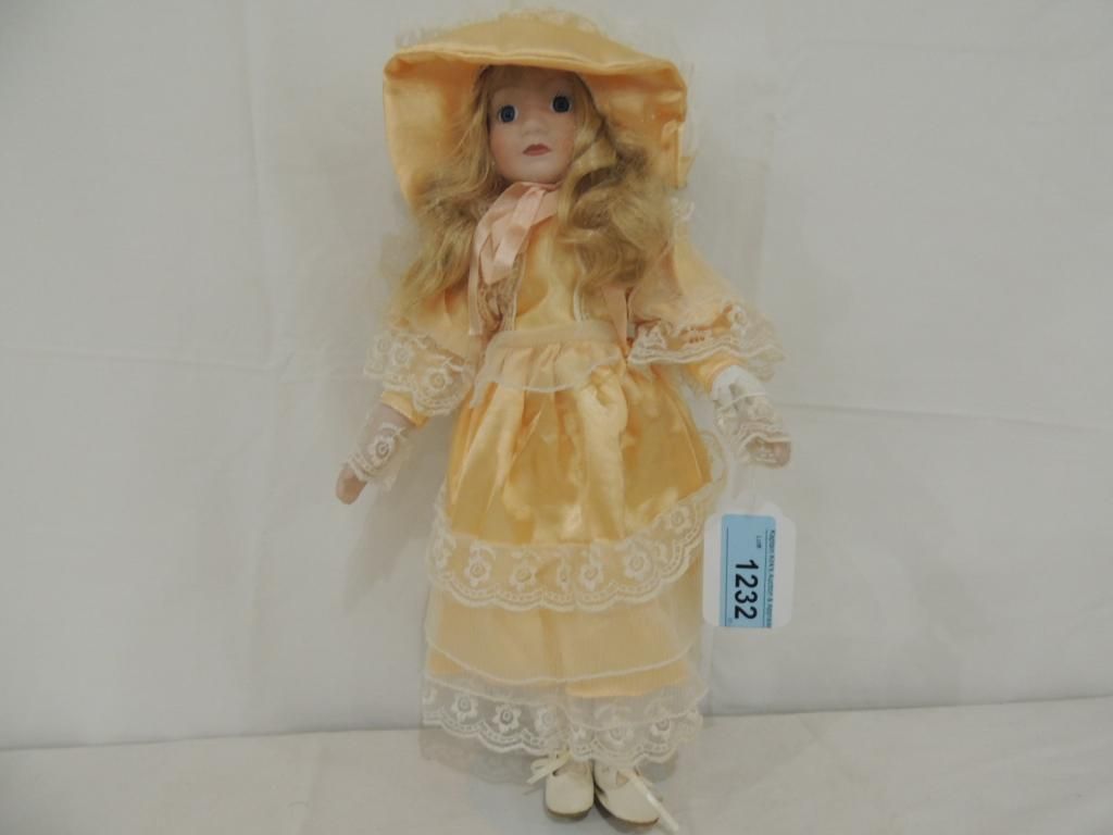 PEACH DRESS WITH LACE AND BLONDE CURLS AS SHOWN. SEE PHOTO FOR MORE DETAILS.
