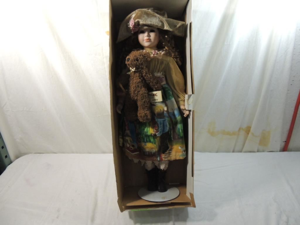 MISSING EYES, COLLECTIBLE DOLL, VINTAGE DOLL, HAND PAINTED DRESS, PICNIC BEAR, AS SHOWN SEE PHOTO FOR MORE DETAILS