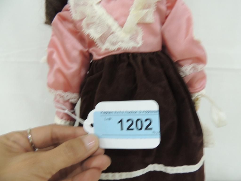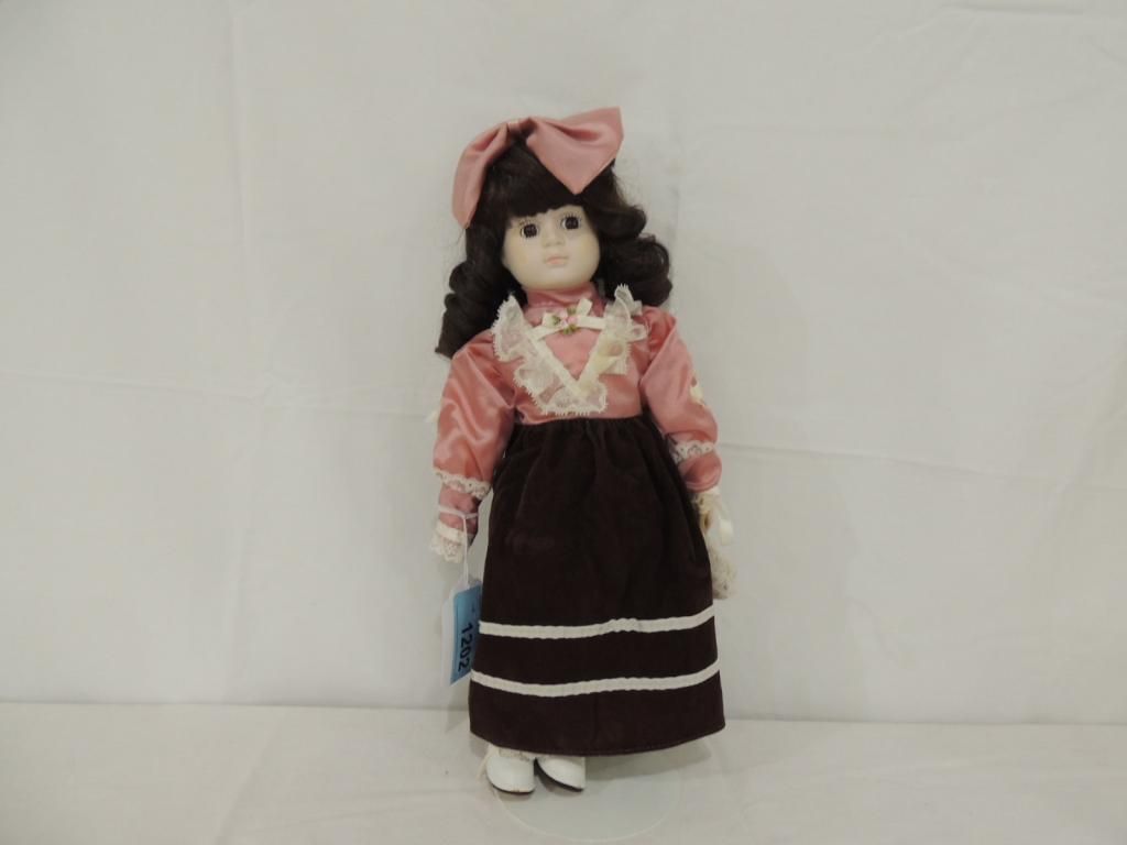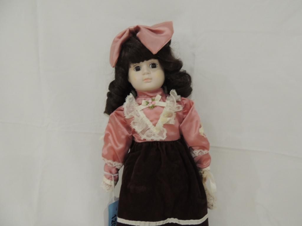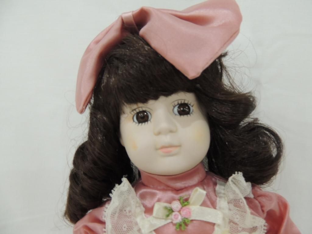 PORCELAIN DOLL PINK AND BROWN DRESS WITH LARGE BOW AND BROWN CURLS AS SHOWN SEE PHOTO FOR MORE DETAILS.