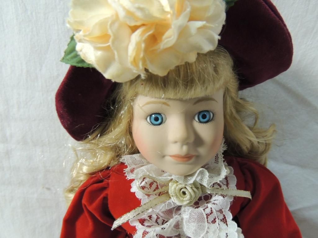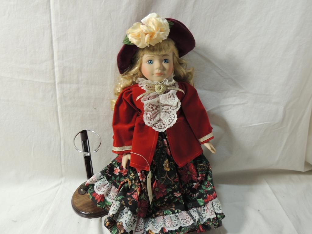 CHRISTMAS FLORAL DRESS WITH RED VELVET JACKET LACE DETAILS. LONG BLONDE HAIR IN RINGLET CURLS. NICE WOODEN FRAME INCLUDED. COLLECTIBLE DOLL. IN BOX. COLLECTORS. GOOD CONDITION. AS SHOWN. SEE PHOTO FOR MORE DETAILS.
