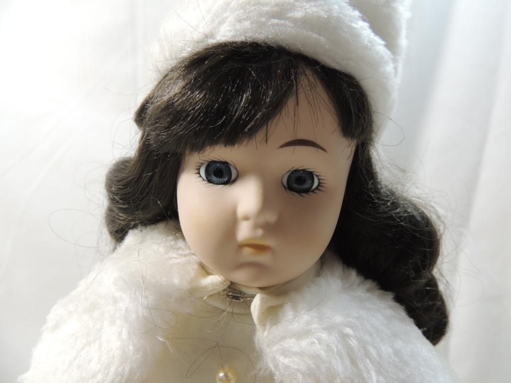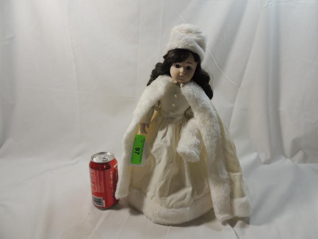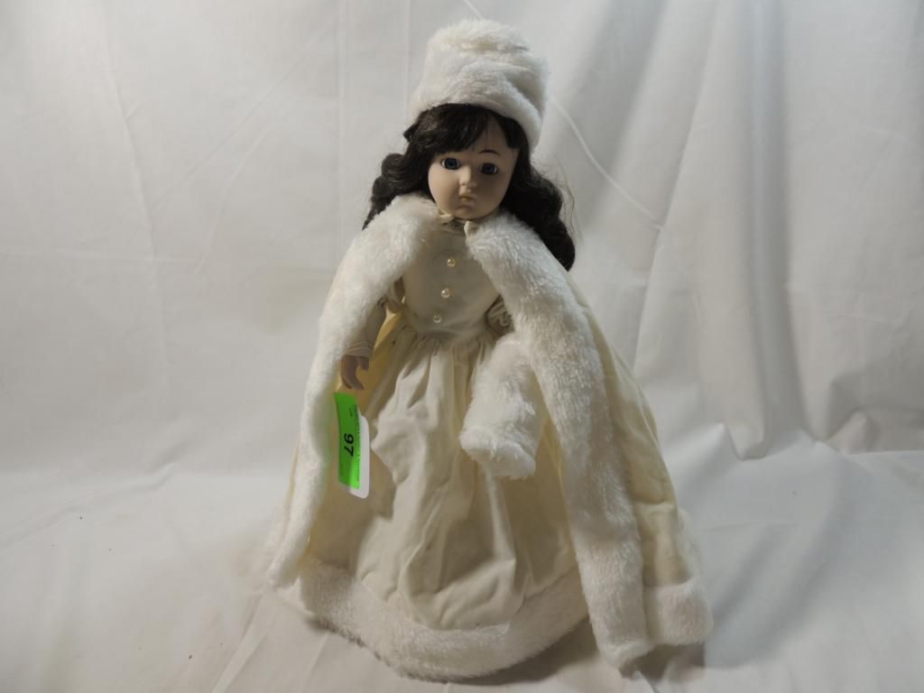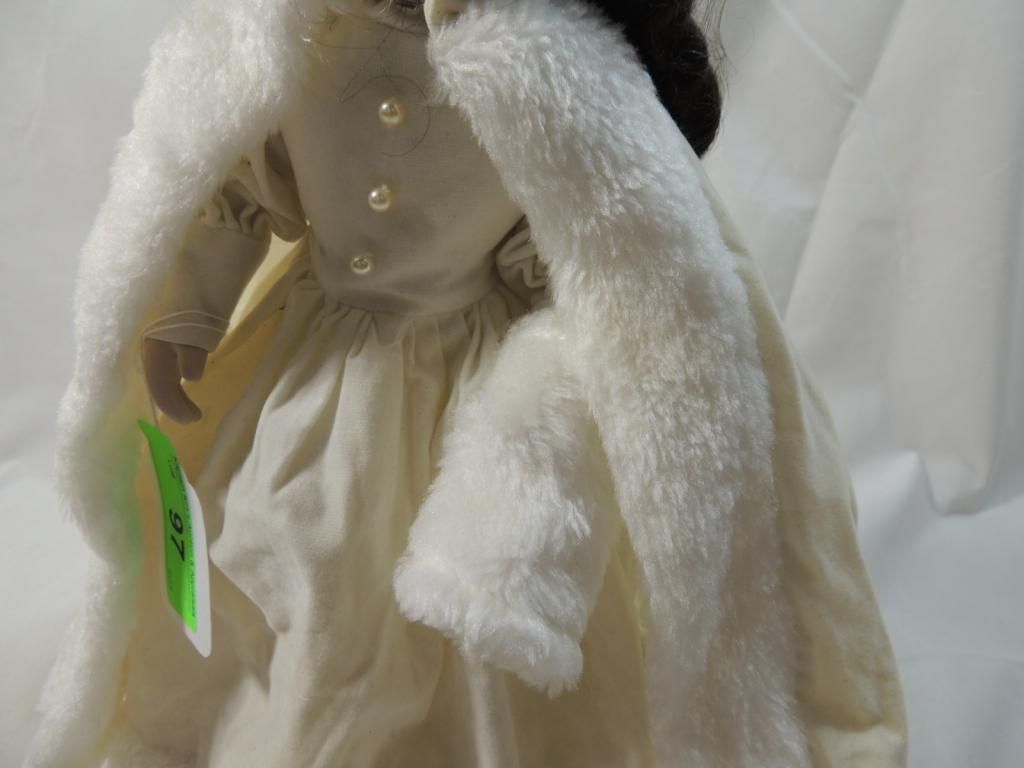 DARK BROWN CURLS IN WINTER WHITE GOWN AND CAPE. AS SHOWN. SEE PHOTO FOR MORE DETAILS.