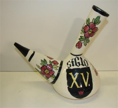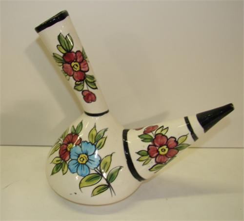 PORCELAIN FLORAL DECORATED DECANTER. Marked on side “Sigio/XV”. No mark on bottom. 9.25” H