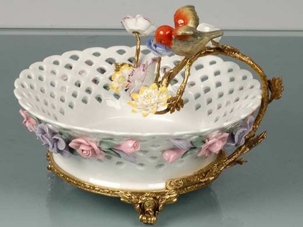 FINE PORCELAIN FRUIT BOWL / CANDY DISH - BRASS BASE AND BRANCH - HAND PAINTED PORCELAIN FLOWERS AND BIRD - 10L" x 10W" x 7.5H"