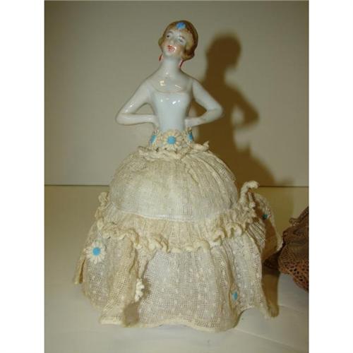 TWO PORCELAIN HALF-DOLL PINCUSHIONS. The taller an Art Deco period flapper with hands at hips, 6.5” high. The smaller a Victorian woman holding a fan, 5” high. Both in excellent condition, with some soiling to dresses.