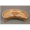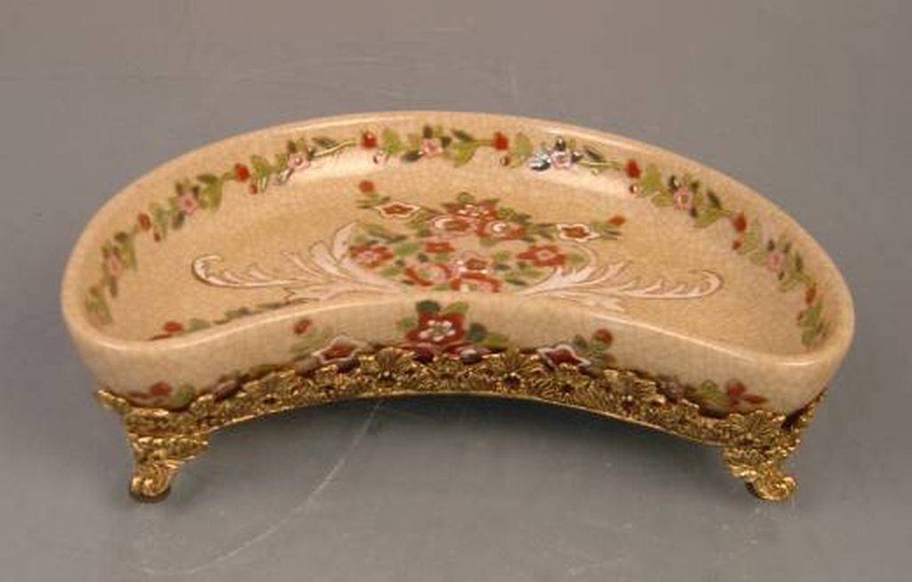 PORCELAIN HALF-MOON CANDY DISH - HAND PAINTED RED AND GREEN FLOWERS WITH GOLD TRIM - VERY ORNATE - REMOVABLE BRASS BASE - 7.2L" x 5W" x 1.8H"