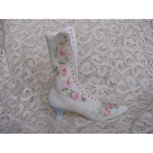 Beautiful vintage porcelain ladies high top boot ornament with handpainted lush soft roses. The boot stands a tad over 5 inches high in very nice condition-no chips or cracks, just perfect to display. This is a gem for the porcelain shoe collector! Shipping within North America is 7.00 International is higher.
