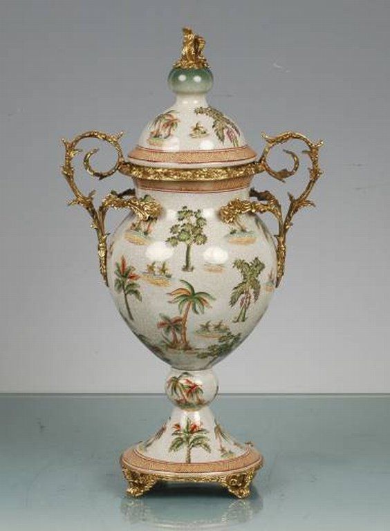 PORCELAIN LIDDED VASE - HAND PAINTED PALM TREES AND DESIGNS - BRASS ACCENTS -11.9L" x7.8W"x 20.9H"