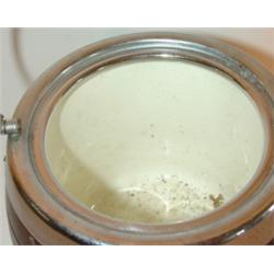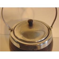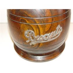 PORCELAIN LINED BISCUIT JAR. Wooden exterior. Lined in porcelain. Silver plate handle and lid. Plate on front of body reads "Biscuits". 10.5" H to top of handle.