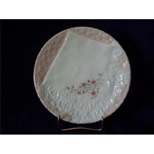 This is a lovely antique Victorian napkin plate. It is make of porcelain and has a pink baketweave background with a folded napkin raised in relief on the plate. The napkin has pink flowers in the corner. The gold trim around the plate is slightly worn. The mark on the back is 05046. There are no chips or cracks. Condition is very good.
