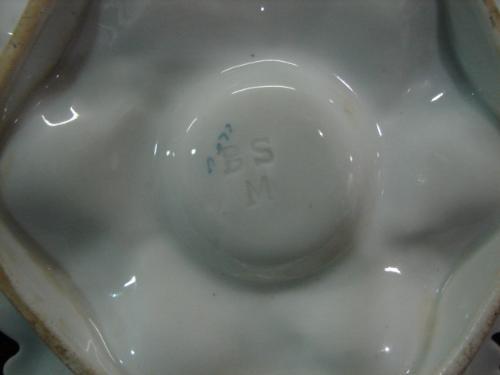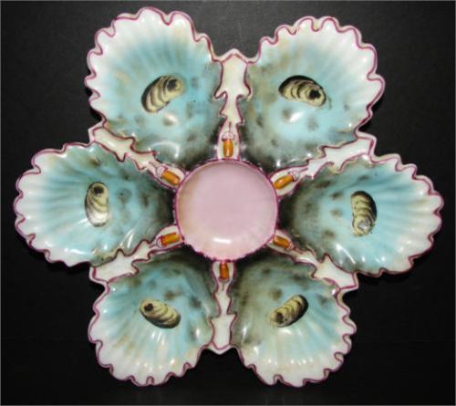 PORCELAIN OYSTER PLATE. Relief shell decorated with blue, pink, & lavender paint decoration. Marked on bottom “BS/M”. 9.75” Dia.