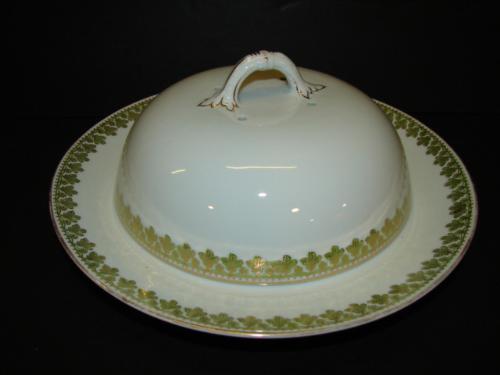 IMPERIAL CROWN CHINA AUSTRIAN PORCELAIN PANCAKE DISH WITH LID. Green and gilt decorated leaf design around border of plate and at bottom edge of lid. Marked on bottom. 4.5” H, 9.75” Dia.