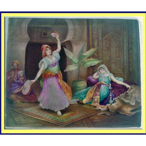 Artist Signed KPM style hand painted porcelain plaque. Made in Germany or France, 19th century.<BR>9 1/4 inches accross and 7 5/8inches height.<BR>Harem oriental scene. Within a richly carpeted Turkish style building, two musicians sit in the background. Center stage is a dancing beauty, tambourine in each hand, magnificent silks wound around her body and head, lots of jewelry. On the right, lieing on rich maroon and leopard skin rugs, another woman languishes, fanned by the large leafed plants above her, and a hookah within easy reach. Very fine detail from the rugs on the walls and floor, to the delicate tones of skin, eyes and textiles.<BR>Artist signed E Bonnet lower right. There is an impressed factory mark on the back.<BR>Very good condition - no chips/cracks/losses of any sort.
