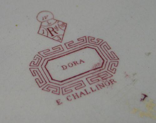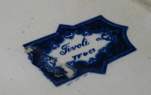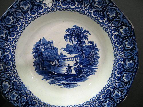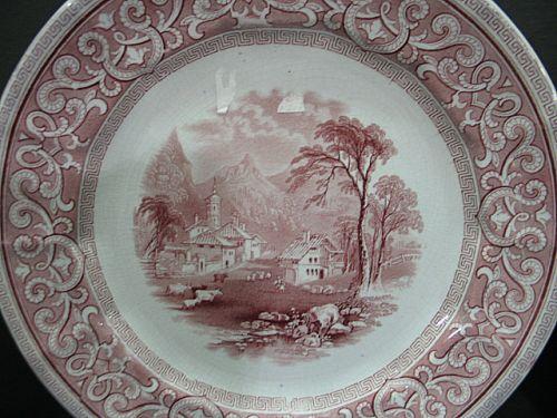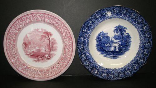 PORCELAIN PLATE & BOWL. Consists of one blue transfer decorated cream soup bowl with rivers scene. Marked on reverse “Tivoli-T.F. & Co.” Shows signs of crazing. 10.5” Dia. Also consists of one red transfer decorated plate with village scene. Marked on reverse with British registry mark and “Dora-E. Challinor”. Shows signs of crazing. 10” Dia.