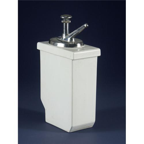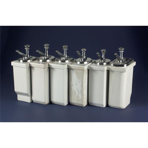 Six vintage porcelain soda fountain/ice cream parlor syrup dispensers to include five matching, Hall China and one Phillip's MFG. All have steel lids and innards. One has an unmarked knob and the others are marked Root Beer, Coca Cola, Cherry, and two Strawberry. The dispenser with the unmarked knob has a crack noted to top and the container with the Coca Cola knob is heavily crazed. All measure approx. 10'' x 7.5'' x 4''.