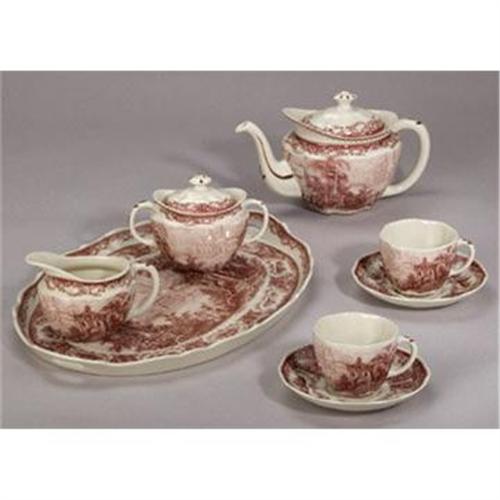 Red and white transferware porcelain features castle and countryside Toile pattern with floral trim. Lids are removable. Dimensions: Tray:17"w, 11"d; Teapot:6"h, 9"w, 5"d; Creamer:3.5"h, 5.5"w, 3.5"d; Sugar:4.5"h, 6"w, 3.5"d; Cup:3"h, 4"w, 3"d; Saucer:6"diam