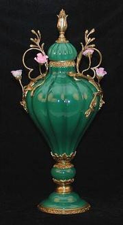 JADE COLORED PORCELAIN URN WITH BRASS ACCENTS - PINK SILK FLOWERS ON HANDLES - 20.1L" x 12.6W" x 22.4H"