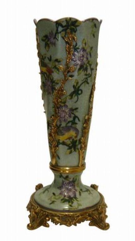PORCELAIN VASE W/ BRASS TRIM - CRACKLED FINISH - HAND PAINTEDFLORAL AND BIRD DESIGN - BRASS ACCENTS AND BASE - 5L" X 5W" X 11.3H"