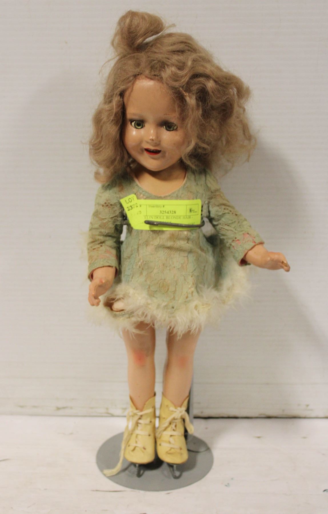 PORCELIN DOLL BLONDE HAIR - GREEN LACE DRESS,