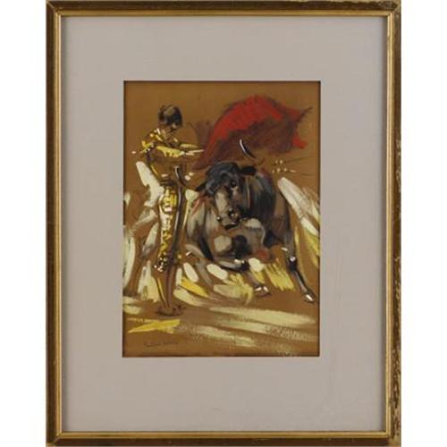 <B>PORFIRIO SALINAS (1910-1973)<BR></B></I>Untitled Bull Charging<BR>Gouache and pen on paper<BR>9 x 6-1/2 inches (22.9 x 16.5 cm)<BR>Signed lower left<BR><BR> This quick sketch of a bullfighter executing a pass emphasizes the unflinching quality of the toreador while confronting the charging bull.<BR><BR><B>Condition Report:</B> Excellent condition. Period frame in excellent condition.<BR><BR><b>Shipping:</b> Requires 3rd Party Shipping (<a target="_blank" href="http://www.heritageauctions.com/common/shipping.php">view shipping information</a>)