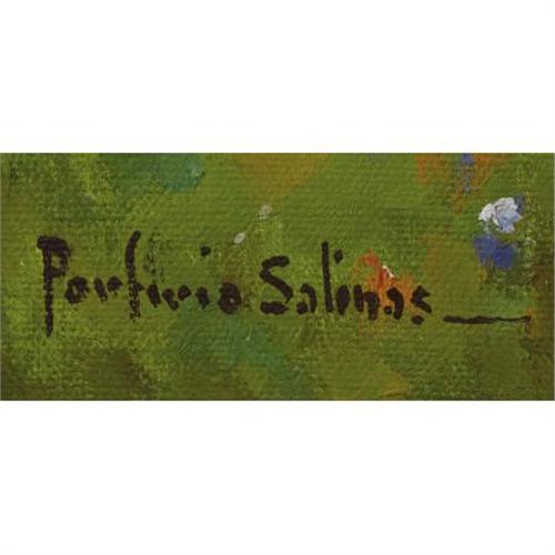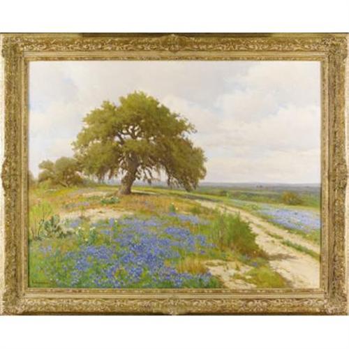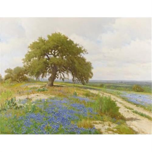 <B>PORFIRIO SALINAS (1910-1973)</B></I><BR>Untitled Bluebonnets and Oak<I>, </B></I>1950s<BR>Oil on canvas<BR>28 x 36 inches (71.1 x 91.4 cm)<BR>Signed lower left<BR><BR> An old dirt road, bluebonnets at the top of the hillside in the well drained soil they prefer, occasional Indian paintbrushes, prickly poppies, and flowering prickly pear cactus; all are lorded over by the stately sentinal oak at the top of the hill. Likely over one hundred years old, it overlooks the valley below, having seen many seasons of change.<B>Condition Report:</B> Excellent condition. Period frame in excellent condition.<BR><BR><b>Shipping:</b> Requires 3rd Party Shipping (<a target="_blank" href="http://www.heritageauctions.com/common/shipping.php">view shipping information</a>)
