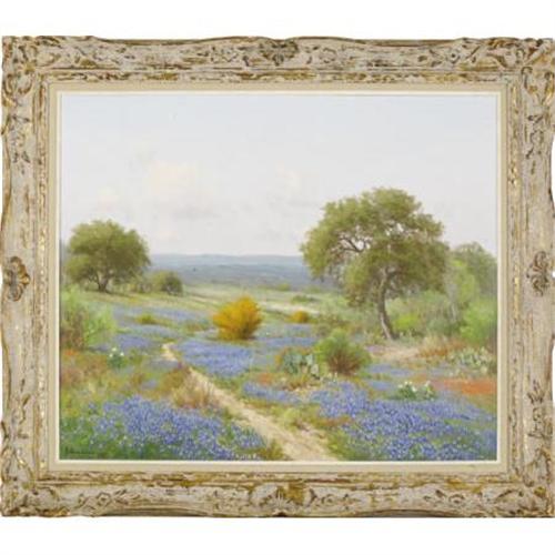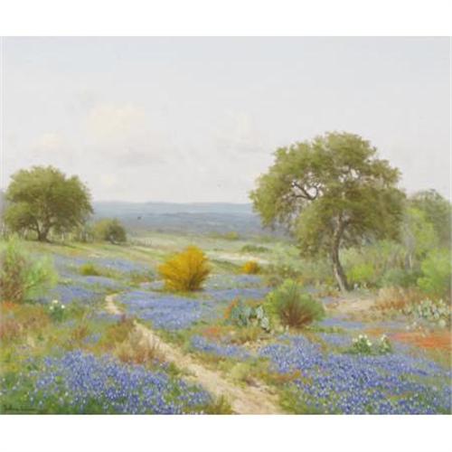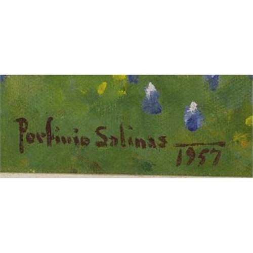 <B>PORFIRIO SALINAS (1910-1973)</B></I><BR>Untitled Bluebonnet Path<I>,</B></I> 1957<BR>Oil on canvas<BR>25 x 30 inches (63.5 x 76.2 cm)<BR>Signed and dated lower left<BR><BR> A lazy trail winds through the bluebonnets in the Texas Hill Country. Bluebonnets, Indian paintbrushes, coreopsis, prickly poppies, and blooming prickly pear add color to the scene. The eye is drawn into the picture directed by the dirt path. The hazy moisture-laden atmosphere of a Texas spring obscures the details of the hills in the distance.<BR><BR>This fine bluebonnet painting was purchased from the artist by Harry Jersig, the CEO of Lone Star Brewing of San Antonio. It was possible Harry Jersig had a long time relationship with Salinas, because one of the artist's first reported jobs was painting beer signs on the side of delivery trucks (Prohibition ended in 1933).<BR><BR>Provenance:<BR>Acquired from the artist by Harry Jersig, CEO, Lone Star Brewing, San Antonio, Texas<BR>Acquired by descent from the artist by the present owner<B>Condition Report:</B> Excellent condition. Period frame in excellent condition.<BR><BR><b>Shipping:</b> Requires 3rd Party Shipping (<a target="_blank" href="http://www.heritageauctions.com/common/shipping.php">view shipping information</a>)
