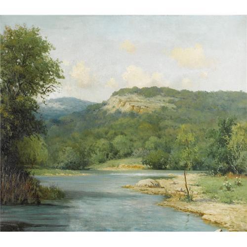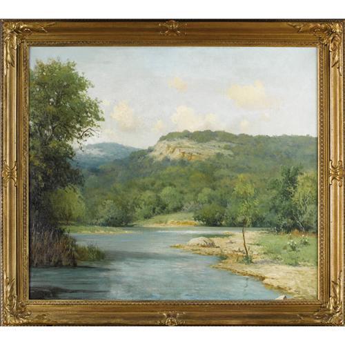 <B>PORFIRIO SALINAS (1910-1973)</B></I><BR>Untitled Hill Country River<BR>Oil on canvas<BR>28in. x 32in.<BR>Unsigned<BR><BR>This well painted Hill Country river scene by Porfirio Salinas was damaged on the left edge by a candle which caught the frame on fire. The frame and painting were conserved by George Attal of Austin, Texas. Unfortunately, the signature was removed in the process of cleaning soot from the surface. A signed statement from the owner is included, as well as a copy of the restoration invoice.<BR><BR>Label:<BR>Bradford Paint Company (Salinas's dealer) (label attached verso)<BR><BR> <B>Condition Report:</B> Painting and frame damaged by fire. Artist's signature was removed when cleaning soot from lower left corner. Inpainting to left side in water and sky. Small hole in water (lower center). Painting has been consolidated with beeswax. Period frame in good condition. Fire damage to frame in lower left corner was repaired.<BR><BR><b>Shipping:</b> Requires 3rd Party Shipping (<a target="_blank" href="http://www.heritageauctions.com/common/shipping.php">view shipping information</a>)