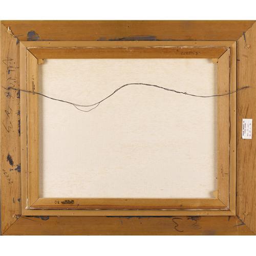 <B>PORFIRIO SALINAS (1910-1973)</B></I><BR>Untitled Caliche Road with Post Oak and Prickly Pear<BR>Oil on canvas<BR>24in. x 30in.<BR>Signed lower left<BR><BR>This composition was done from a vantage point on the side of a caliche road. The artist has pulled his car over and is painting looking down hill into the valley. A blooming prickly pear is several feet in front of the easel. Bright light is streaming down and in the distance dark clouds hug the valley.<BR><BR>This kind of view (without fences, telephone poles, and other man-made visual obstacles) was much more common in Salinas' time than it is today.<BR><BR> <B>Condition Report:</B> Excellent condition. Period frame in excellent condition.<BR><BR><b>Shipping:</b> Requires 3rd Party Shipping (<a target="_blank" href="http://www.heritageauctions.com/common/shipping.php">view shipping information</a>)