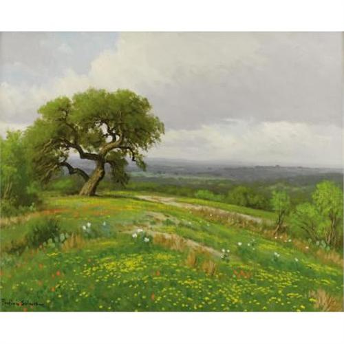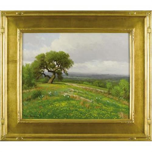 <B>PORFIRIO SALINAS (1910-1973)</B></I><BR>Untitled Landscape<BR>Oil on canvas<BR>16 x 20 inches (40.6 x 50.8 cm)<BR>Signed lower left<BR><BR> In this well composed Hill Country wildflower painting, Salinas has chosen to paint coreopsis and Indian paintbrushes, instead of the more commonly depicted bluebonnets. The artist creates an illusion of distance and depth by placing objects at various distances from the foreground, as contextual cues for the eye. In the very bottom right corner of the painting is a clump of grass extending out of the picture plane. A little further, there are more clumps of grass and prickly poppies. A little further still, there is to the left a bush and prickly pear. A little further still and there are small trees on either side of the canvas. Approaching midground is the large solitary oak. Then receding into the distance are clumps of bushes and trees. Even further still, in the remote hills, Salinas uses atmospheric effects to show distance. This layering of objects, and the skilled use of atmospheric effects, combine to produce a superb rendition of the Texas Hill Country in spring time.<BR><BR>Provenance:<BR>Harry Halff Fine Art, San Antonio, Texas<B>Condition Report:</B> Excellent condition. New frame in excellent condition.<BR><BR><b>Shipping:</b> Requires 3rd Party Shipping (<a target="_blank" href="http://www.heritageauctions.com/common/shipping.php">view shipping information</a>)