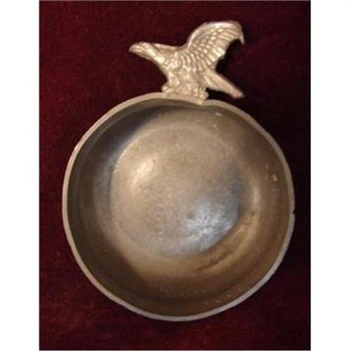 Circa 1875 Pewter Porringer with American Eagle attached. This piece came out of a house in New England. Measures 3 1/2" in diameter and is 1 1/2" in height. We feel that the eagle is a cast metal and was soldered or attached in a similar way at a later date, maybe in 1976 to represent or misrepresent as a centennial piece during our 200 year anniversary. Or it could be earlier and the eagle was added during the 100 year anniversary of our independence.