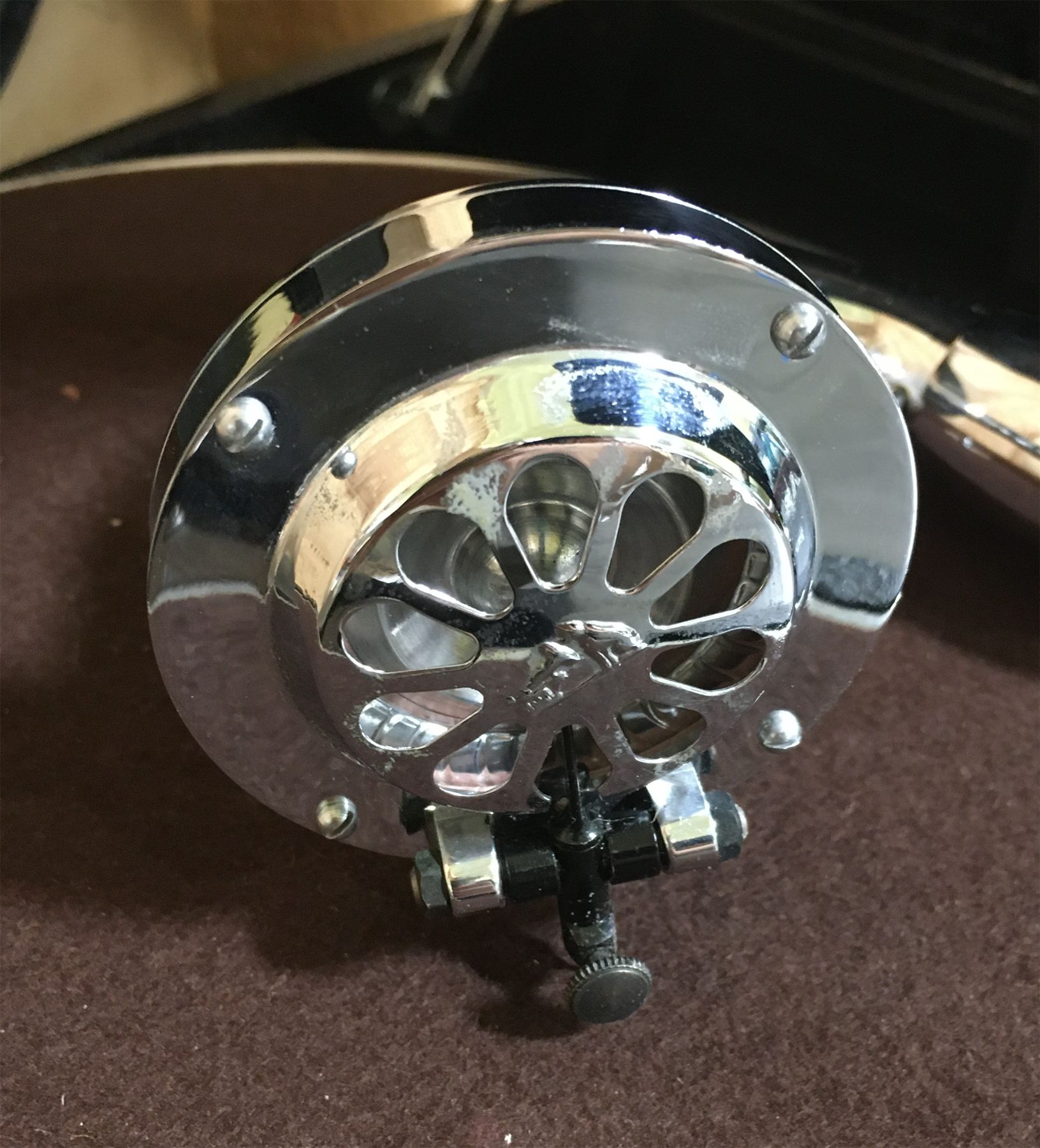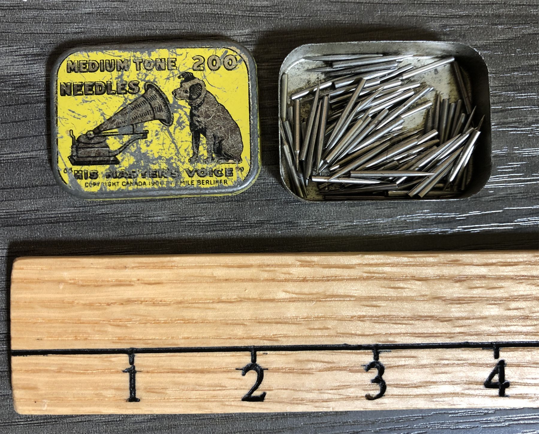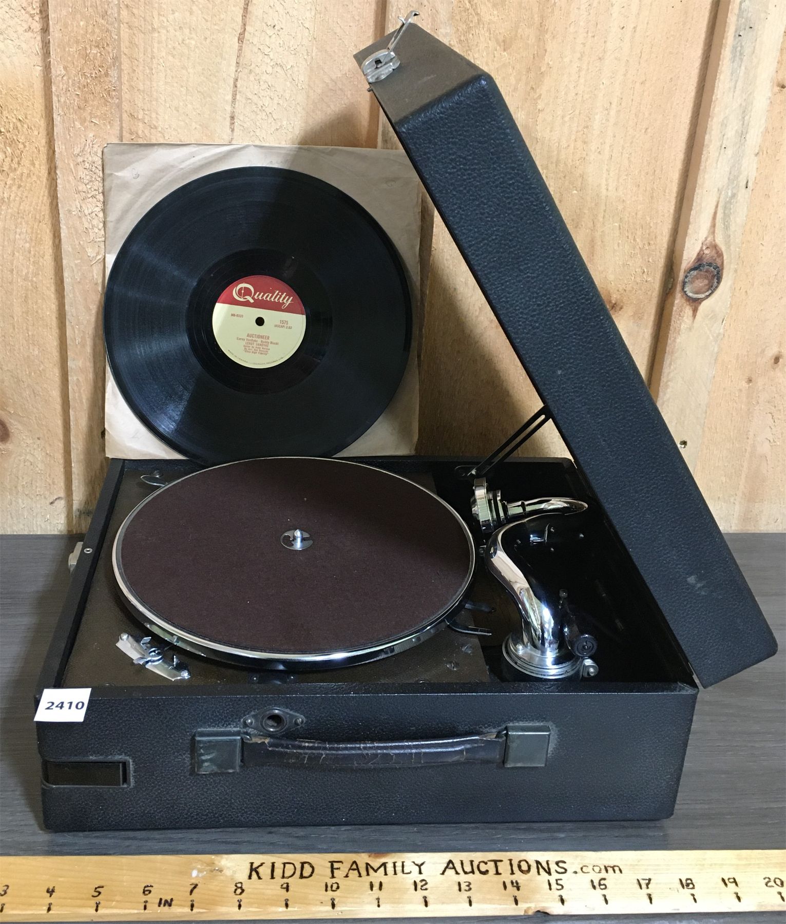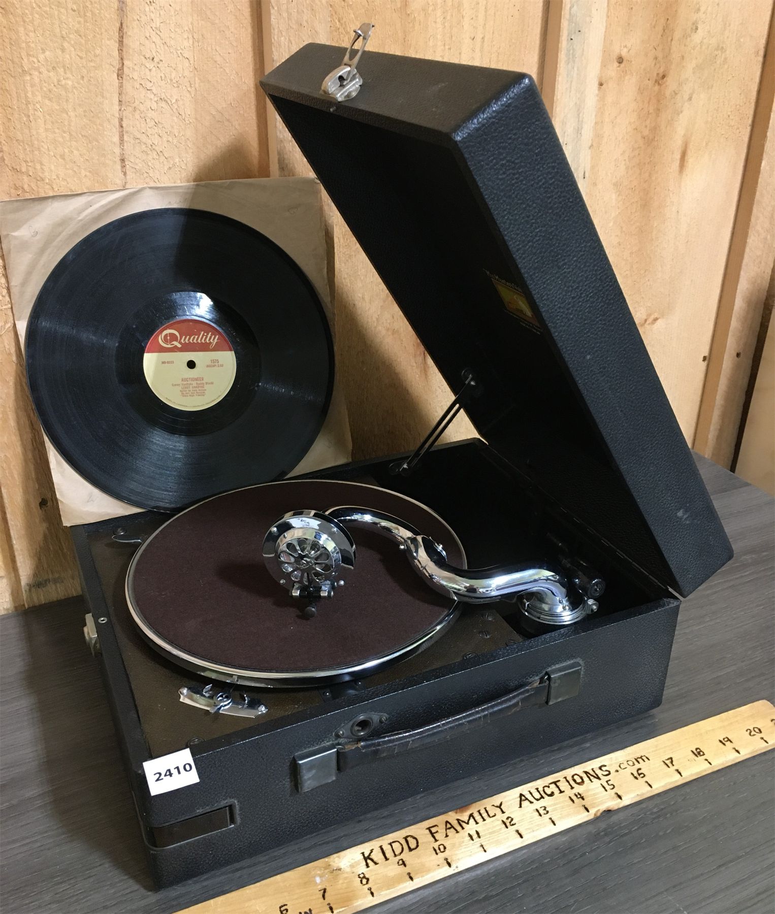NOTE: CONSIGNOR SAYS IT'S IN GOOD WORKING CONDTION. INCLUDES RECORD "AUCTIONEER BY LEROY VANOYKE". INCLUDES NEEDLES AND TIN.