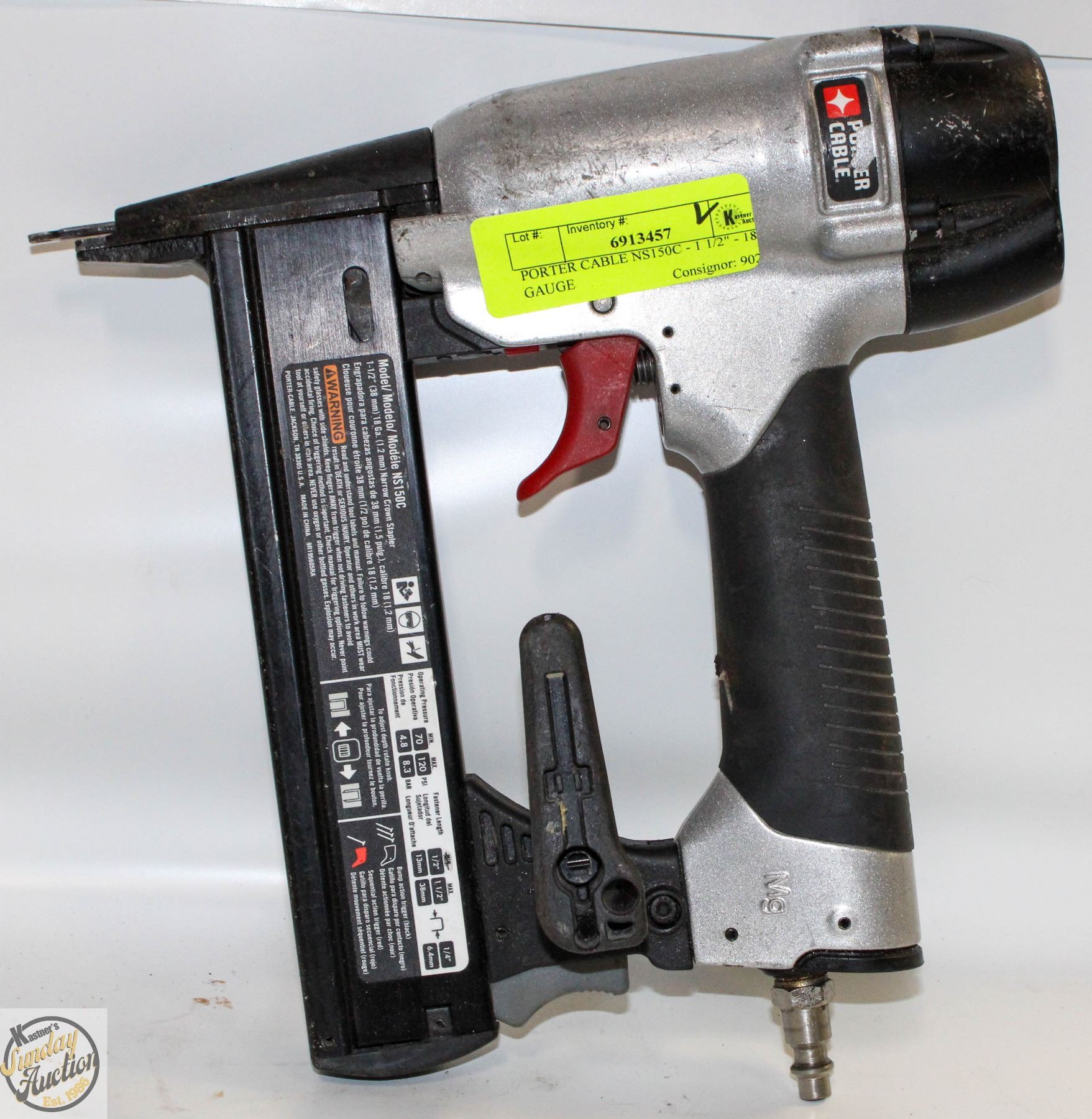 NARROW CROWN AIR STAPLER - 1/2" - 1 1/2" LENGTH X 1/4" WIDE, 70-120 PSI, QUICK EASY RELEASE/RELOAD **ALL ITEMS MUST BE REMOVED BY 5PM SATURDAY, MAY 10TH 2025. ALL REMAINING ITEMS WILL BE SUBJECT TO A $6.00 PER DAY STORAGE CHARGE. ANY ITEMS REMAINING AFTER MONDAY, MAY 26TH 2025 WILL BE CONSIDERED FORFEITED. NO REFUNDS WILL BE ISSUED FOR FORFEITED ITEMS. TO SCHEDULE A PICK UP APPOINTMENT CLICK HERE