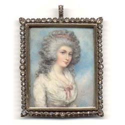 PORTRAIT MINIATURES - A rectangular portrait miniature of a noblewoman, A rectangular portrait miniature of a noblewoman, in the manner of Richard Cosway, wearing a grey wig with pink ribbon, her white dress held with a pink bow, against a blue sky background, with initials RC and date 1787, on ivory, 2.25in x 1.75in, the gold frame set with rose cut diamonds, the reverse with pierced engraved gold initials, with suspender and easel mount