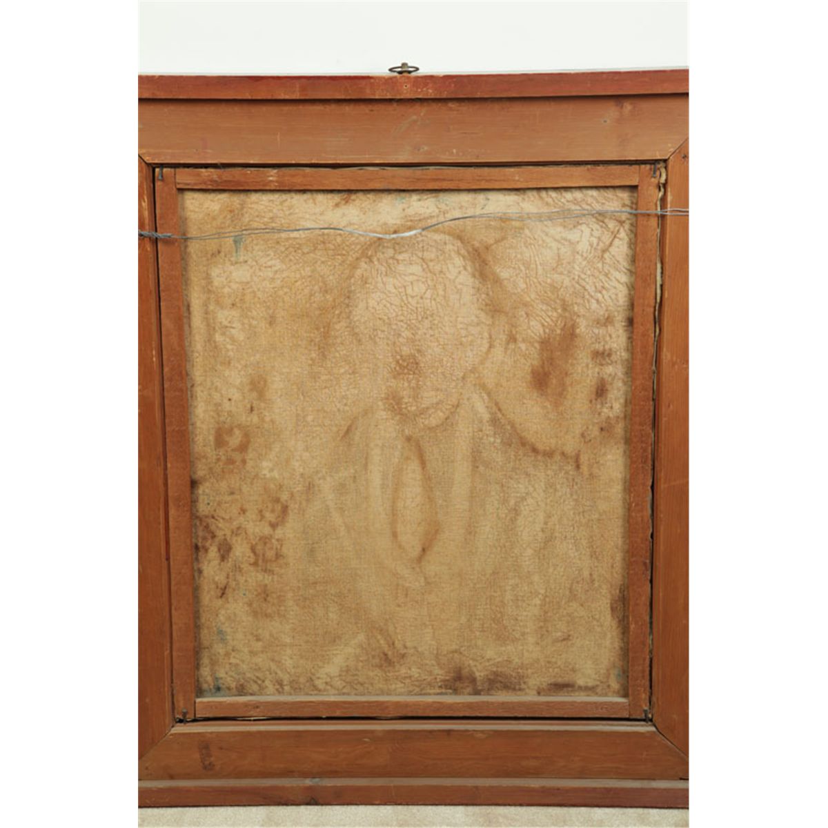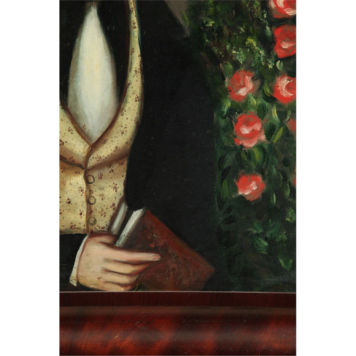 Oil on canvas, unsigned. Boy wearing a yellow vest seated in a rose garden. As found condition. Original ogee frame, 29 1/2"h. 25 1/2"w.