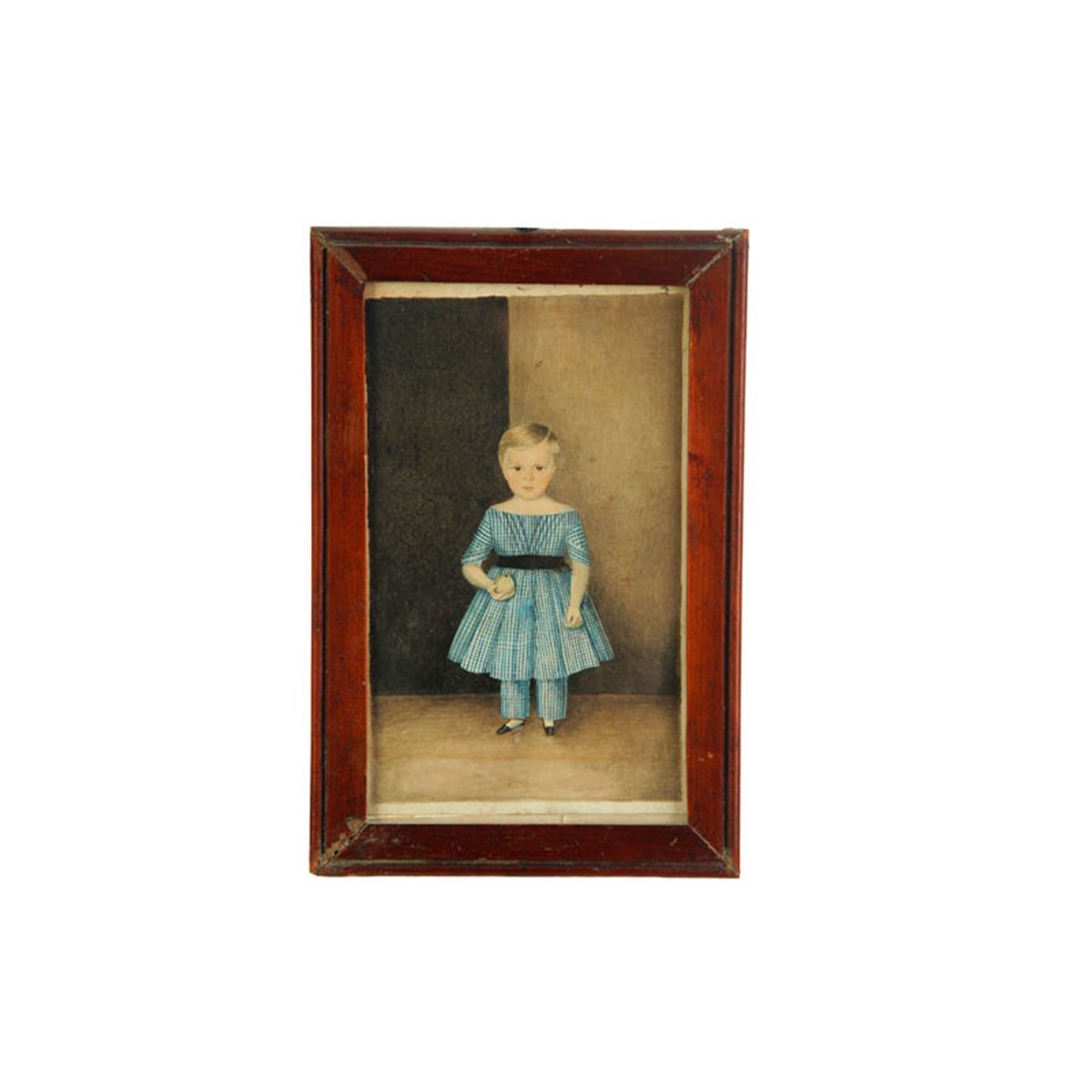 Watercolor on paper, unsigned. Charming full-length portrait of a young boy holding an orange and wearing a blue checked dress. Period frame, 9 1/4"h. 6 1/4"w. Ex David Good (Ohio).