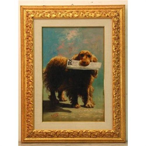 DESCRIPTION: PORTRAIT OF COCKER WITH NEWSPAPER. A nice portrait of cocker, portrayed on profile but with its eyes turned towards the observer. In its muzzle tightens a newspaper, probably the Roma. The warm colours used by the artist to depict the animal is in contrast with the blue sky in the background stained with pink and white veins. The golden frame, finely carved, gives the greatest the painting a great importance.