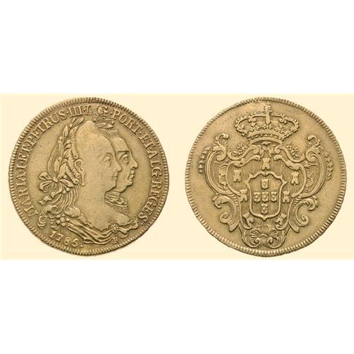 Maria I and Peter III, 1777-1786. 6400 Réis 1785 (14.2 g), Rio de Janeiro. Double portrait right / Arms. Friedberg (Brazil) 76.