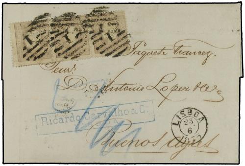 1875 Cover franked with horizontal strip of three 100r. pale lilac King Luiz issue (Sc 45 - perf 12) prepaying the double weight letter rate to Argentina by French paquebot service. Stamps tied by barred oval numeral "1" killers, with LISBOA cds alongside. Front shows manuscript "1/4" postage due, and reverse bears BUENOS AIRES arrival datestamp. Scarce franking on a very fine transatlantic cover.