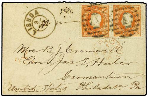 1870 ENVELOPE to Germantown, PA, USA, franked pair 80 reis tied by barred 1 cancel with LISBON datestamp in association. Obverse also bears red PAID LONDON SHIP LETTER cds and 2 CENTS (being amount due to USA) handstamps.