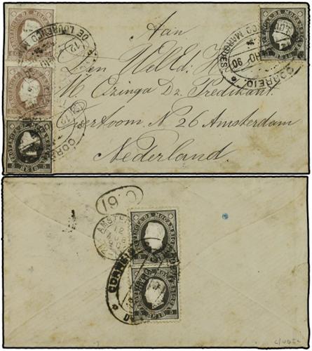 1890 Envelope to HOLLAND bearing Yvert 15, 5r. black (4) and Yvert 19, 40r brown/lilac tied by double ringed oval "CORREIO DE LOURENCO MARQUES" datestamp with AMSTERDAM receiver on reverse. Very fine and rare franking to the Netherlands.