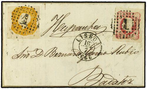1866 (16 Julio) FRONTAL de carta de LISBOA a BADAJOZ (España). Franqueada con 35 reis con sello de D. LUIS I de 10 reis (Afinsa nº 15) y 25 reis (Afinsa nº 16) con amplísimos márgenes.