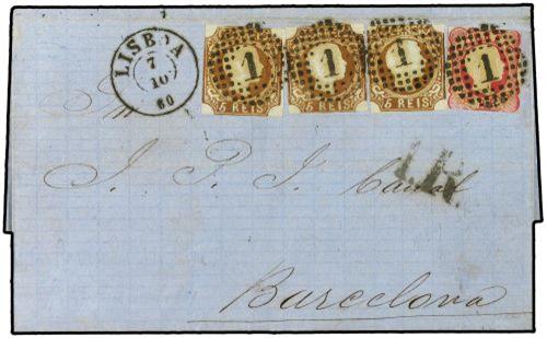 10(3),13 1860 LISBOA a BARCELONA. 5 reis castaño (3) y 25 reis rosa. Tasada a la llegada con 1 real. Muy rara combinación de franqueo. Muy raras las cartas franqueadas con sellos dirigidas a España antes del Convenio Postal.