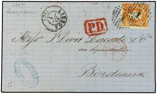 1867 (27 Enero) LISBOA a BURDEOS (Francia), a donde llegó el 29 de Enero. Franqueada con 80 reis (Afinsa nº 24).