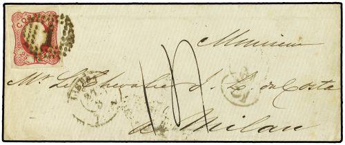 1861 (27 Marzo) LISBOA a MILAN (Italia)a donde llegó el 4 de Abril. Al dorso, marca de tránsito por BADAJOZ (28 de Marzo). Franqueada con sello de 25 reis de D. Pedro V cabellos anulados (Afinsa nº 13).