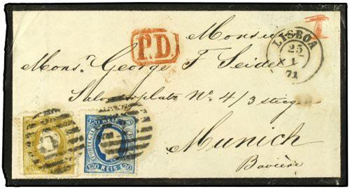 1871 (25 Enero) LISBOA a MUNICH (Alemania) a donde llegó el 4 de Febrero. Franqueada con 140 reis con sellos de 20 reis (Afinsa 39) y 120 reis (Afinsa 44).