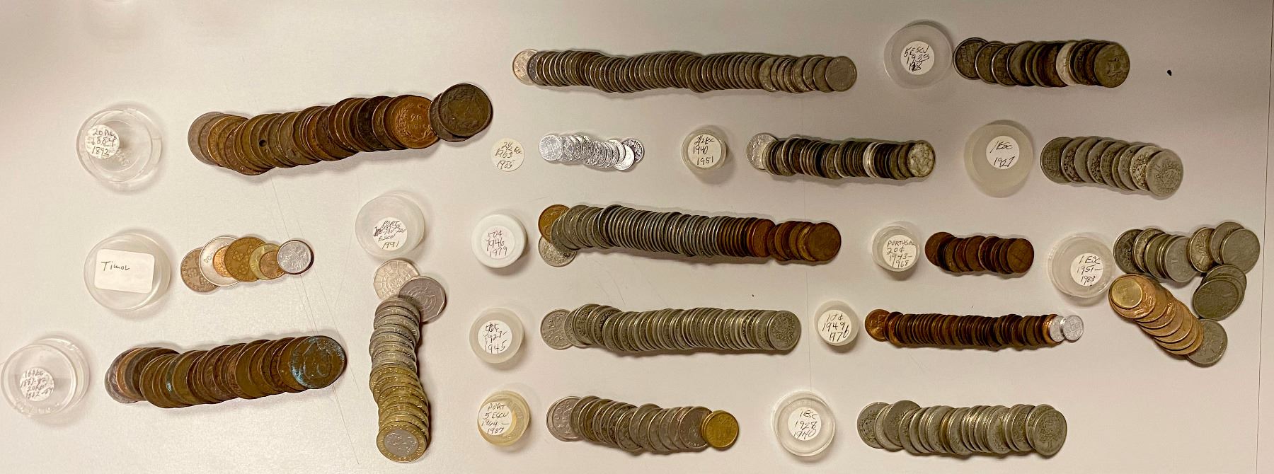 PORTUGAL: LOT of 438 items, including 10 reis (2 pcs), 20 reis (55), 10 centavos (58), 20 centavos (15), 50 centavos (100), escudo (56), 2 1/2 escudos (95), 5 escudos (33), 20 escudos (4), 25 escudos (1), 100 escudos bimetal (8), 200 escudos (7), and non-Portuguese (4); average circulated grades, with many better, many in silver, in consignor's tubes, viewing recommended; retail value $1000, lot of 438 pieces.